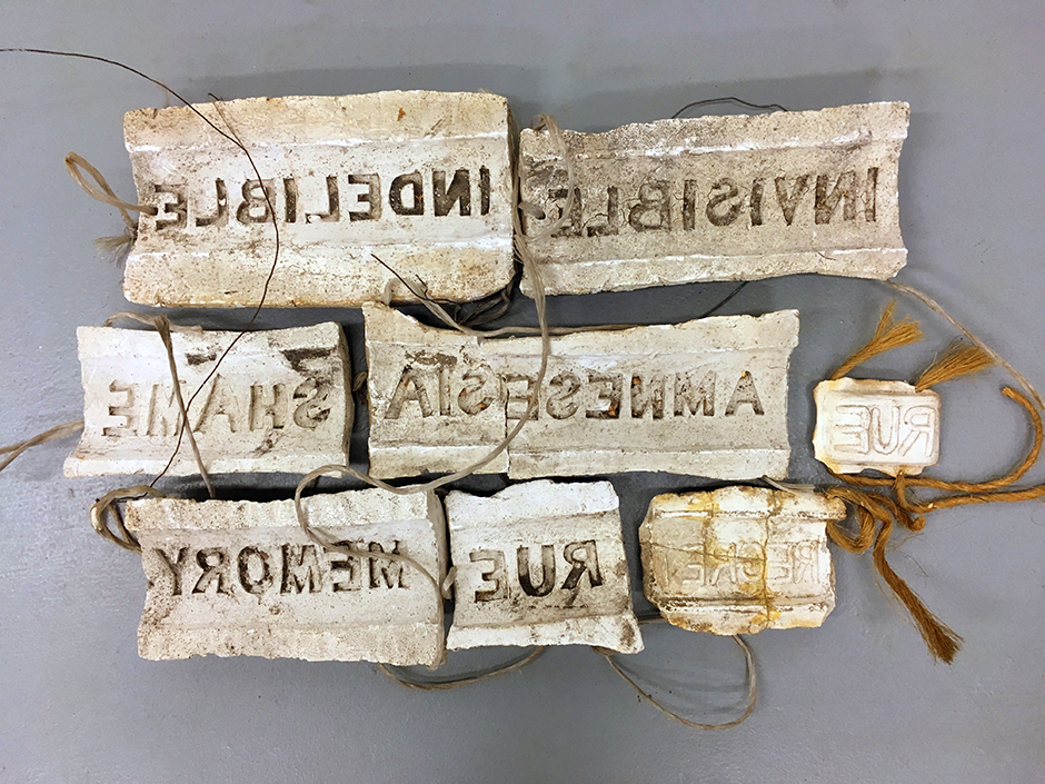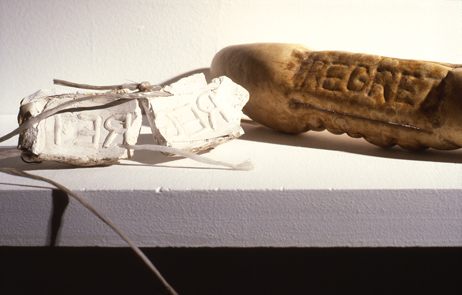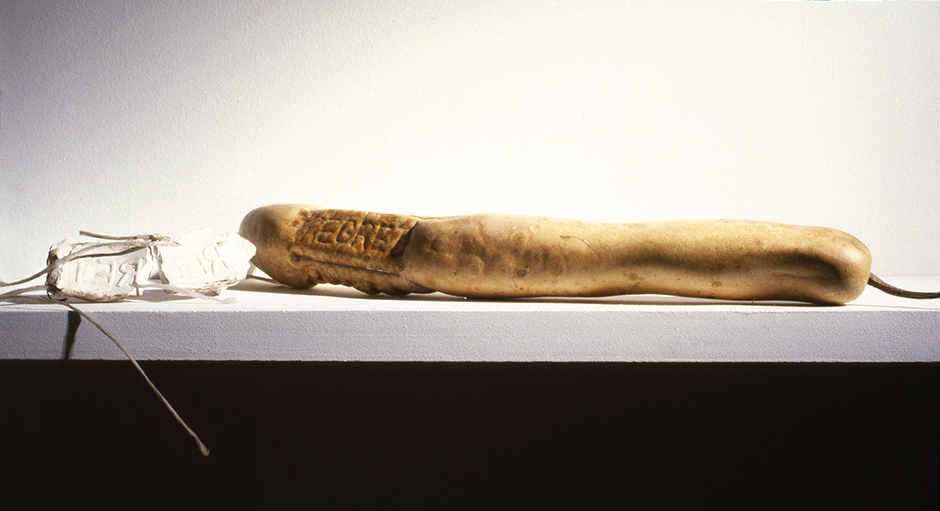 Platonic Solids and Failed Platonics are polyhedra grown in wire cages, emerging to reseamble the Neolithic versions. These have been interpreted as opting for the pre-western, which has gone on to influence the deadly nightshade works of the 1990's. Imprinted Gourds were grown into plaster moulds with words utilizing the embodied memory of the gourd as it grows from a vegetative to a woody material. Other shaped and caged gourds were grown relating to Whitehead's concurrent TOPOLOGY prints and sculptures .
