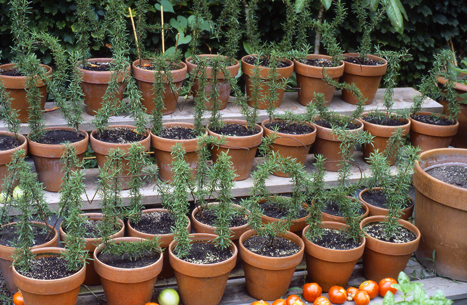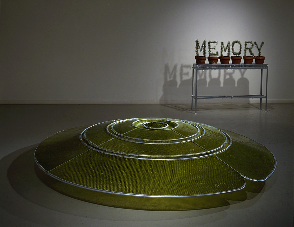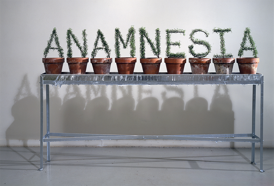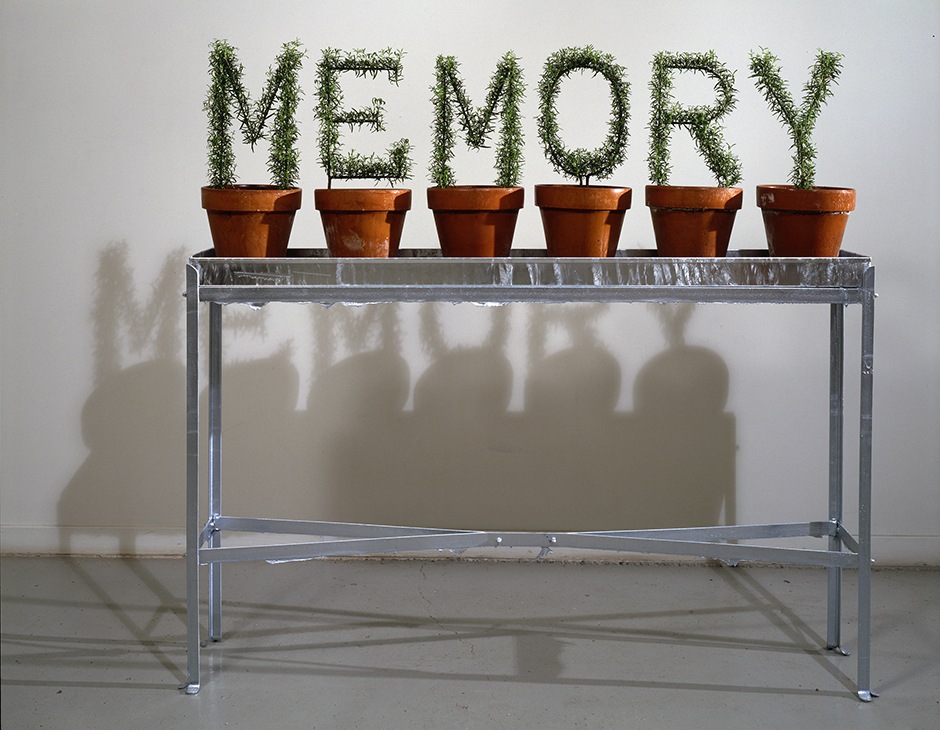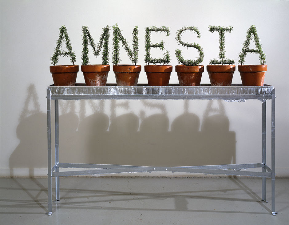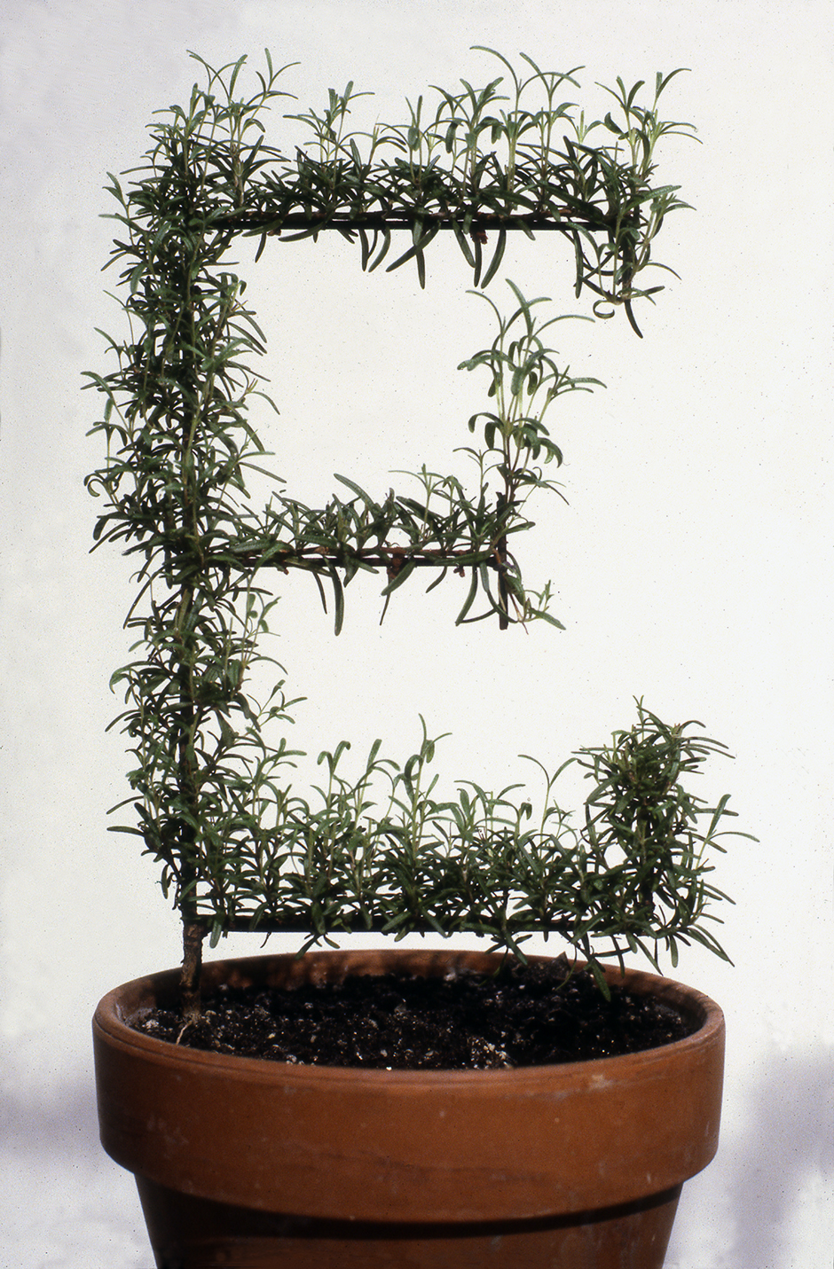 Rosemary: Shaped living plants followed. Rosemary, Rosemarious officianallis famous for its tie to remembrance is easily topiaried and cultivated into MEMORY, AMNESIA and ANAMNESIA (return of memory after amnesia). They silently indict the large dish of Oil of Rosemary, very pungent in smell. While you read the mutable language with your mind you view the immutable object and smell with your body. The dish takes the form of a lotus leaf, eaten by the lotus eaters of literature (lotophagi) to produce willful amnesia. Memory is in forgetfulness.