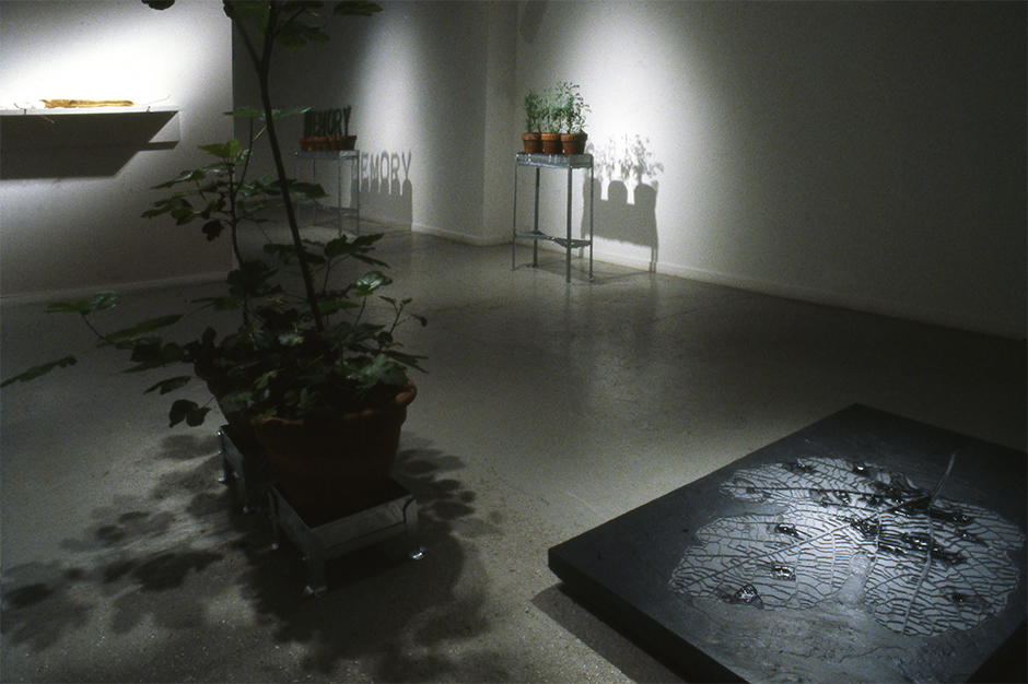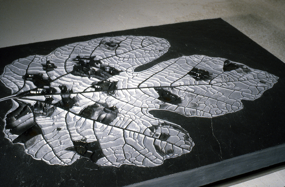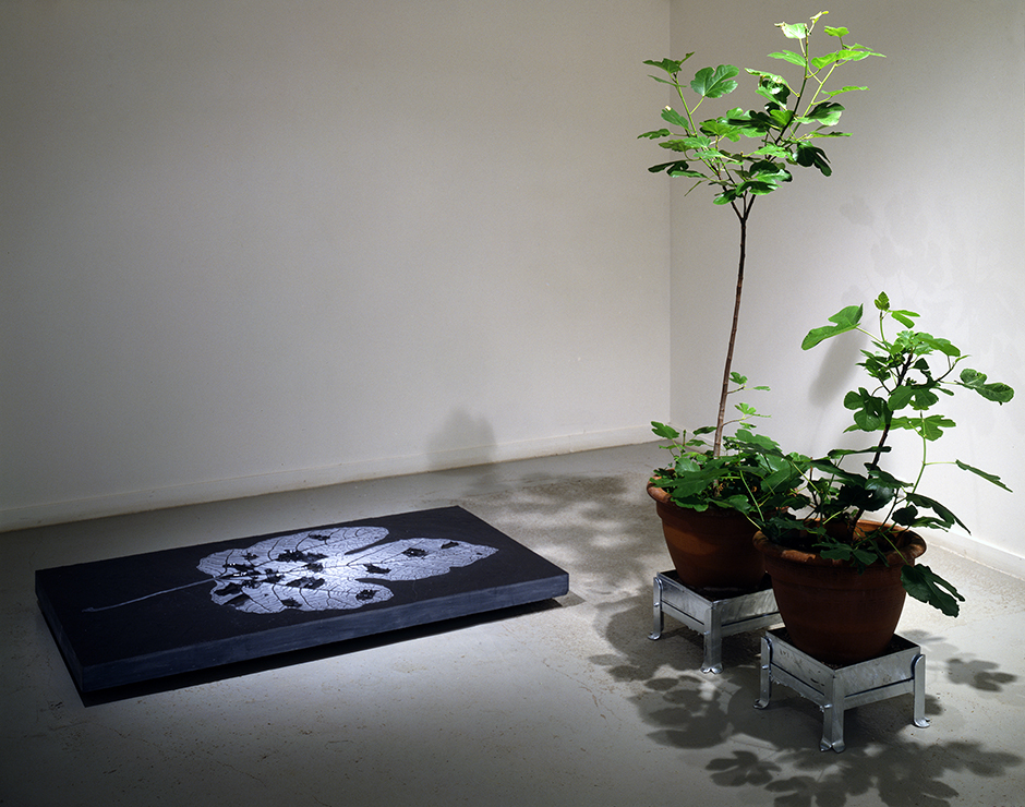 Fig: The untitled slate piece with oil of rue and edible fig Ficus kodata is about lost innocence. The 600 lb. slate is tombstone, fossil, tabla rasa and minimalist sculpture eroding under the small but noxious burden of regret (essential oil of rue). It is a passive dish and a metaphoric relic. It is also a representation of the fig leaf, a charged and recognizable symbol in western culture for guilt, sexual repression, lost innocence and shame. The two fig plants, (like Adam and Eve) stand beside the fossilized version of themselves. The last element of this group of work is the "regret" gourd that is related to the bottle gourd pieces described above.