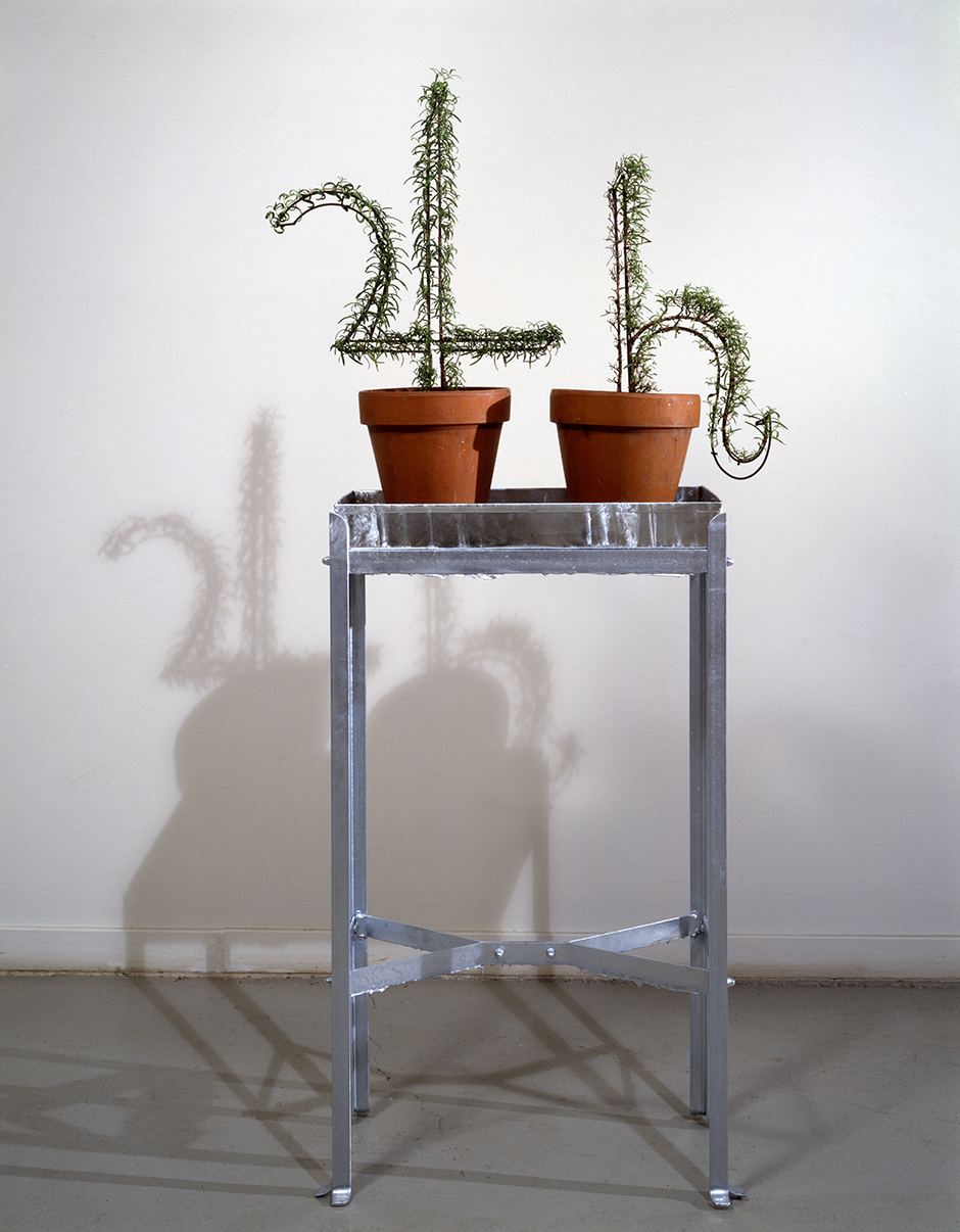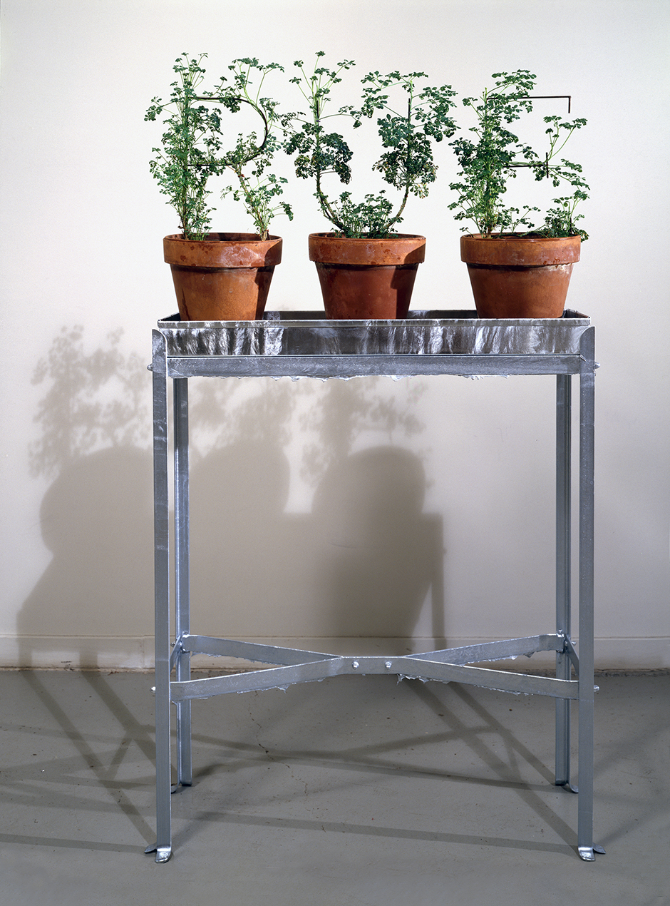 The Lotophagi installation reveals the impact of working with living plant materials and moves Whitehead's work into true post-industrial hybridity. The enormous, iconic, hot-dipped galvanized and shellac "dish" full of aromatic rosemary essential oil signals the shift. Part autonomous METAOBJECT- part botanical representation- the tell-tale leaf form interrrupts the artefactual, industrial logic.