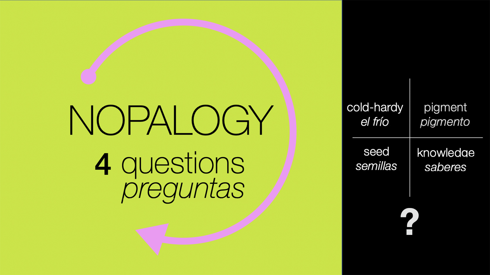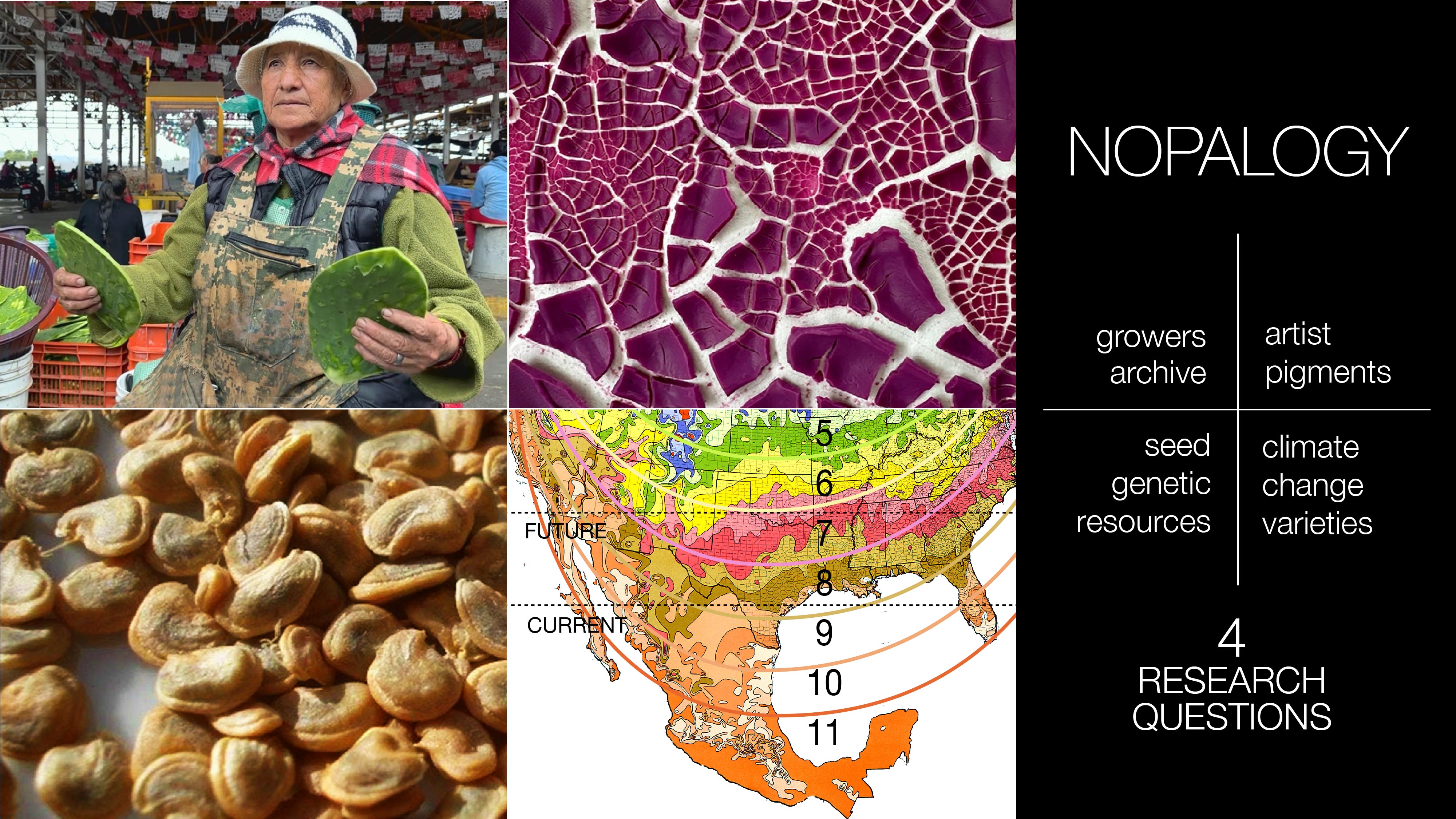 Nopalogy evolves four climate responsive research strategies for the culinary Nopal, including: knowledge stewardship, cold-hardy varieties, seed genetic resources, and artist pigments.