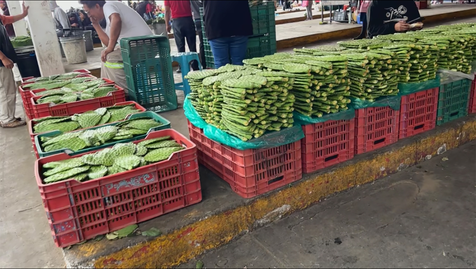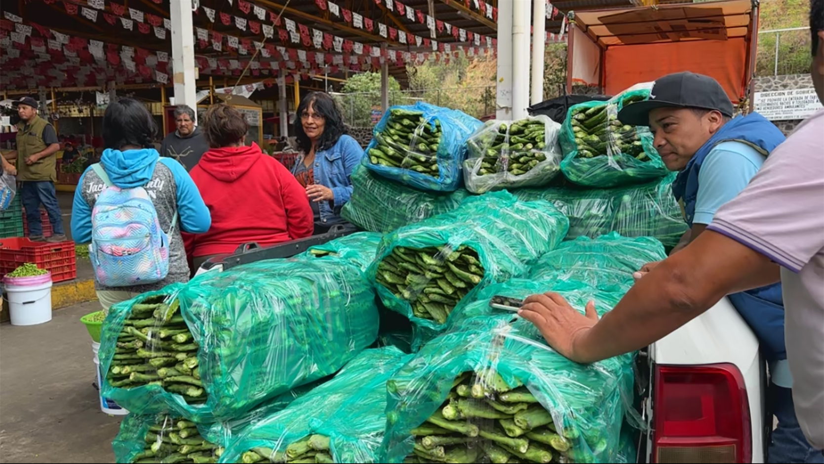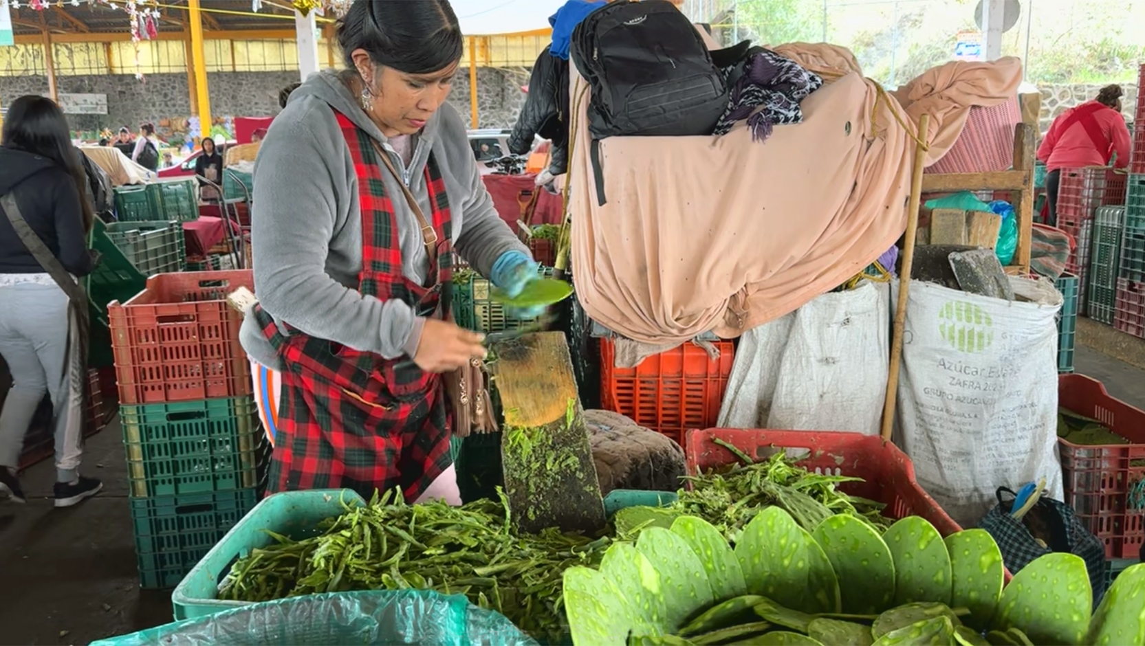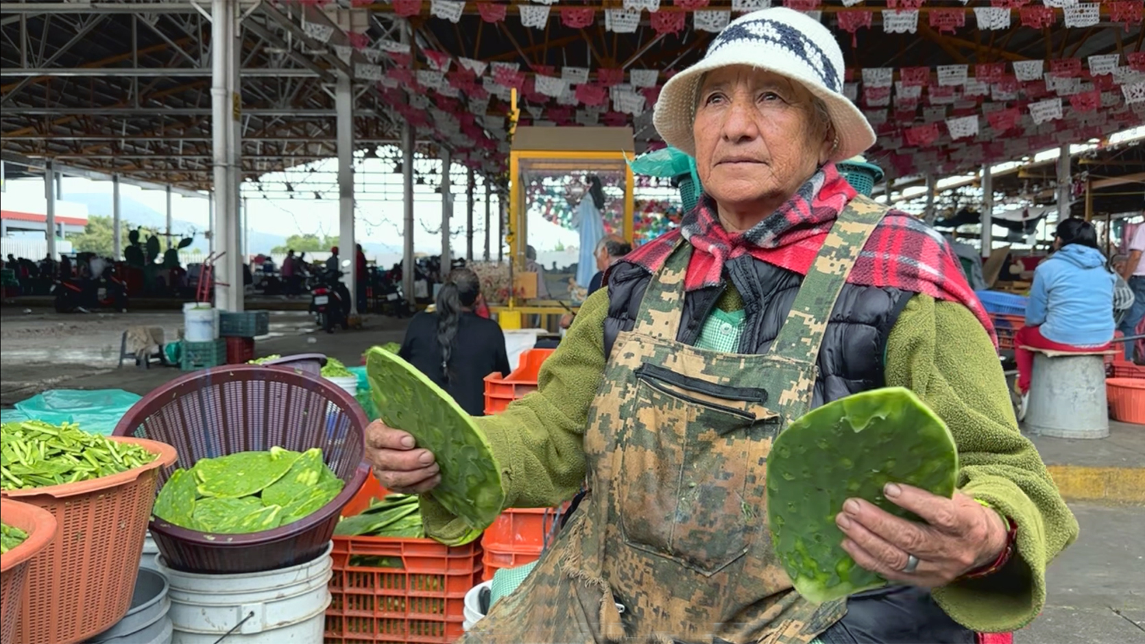 Augustina Gomez Tejadillo, Nopal Grower @ Milpa Alta wholesale market, explaining growing techniques.