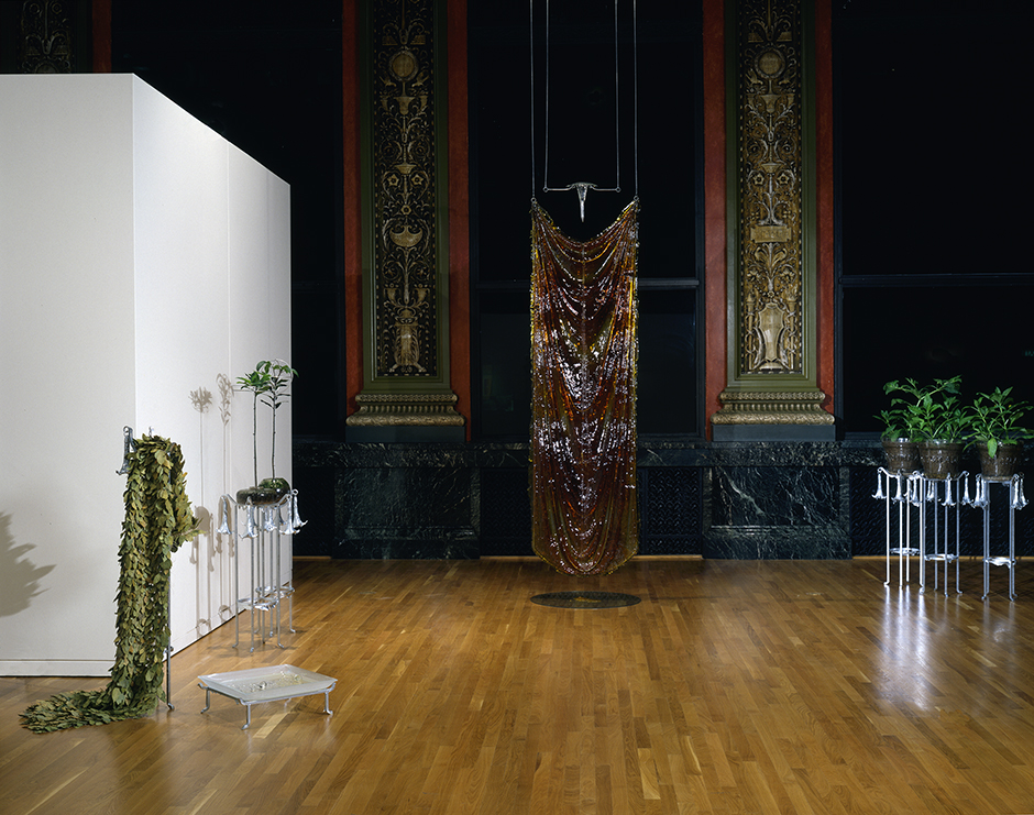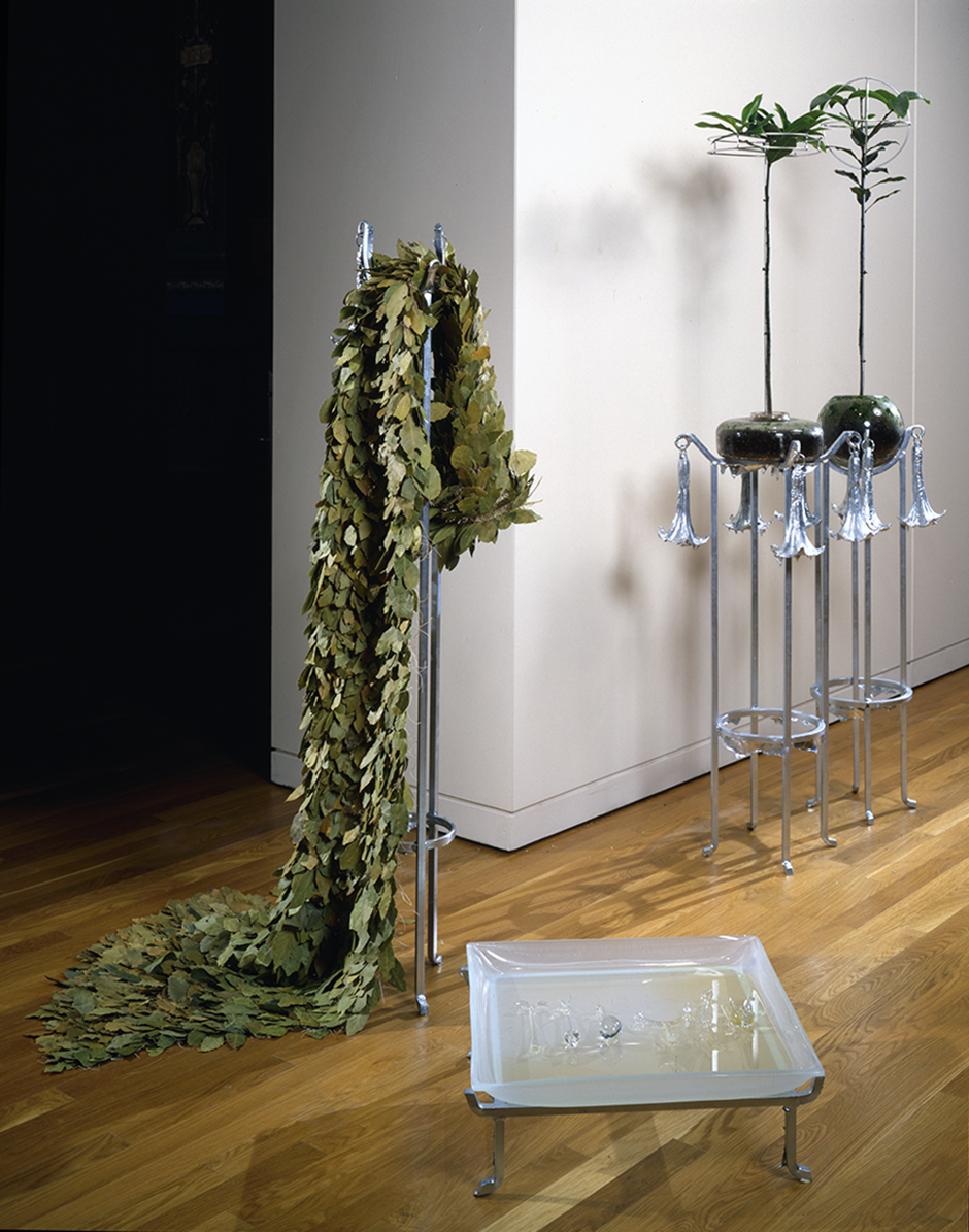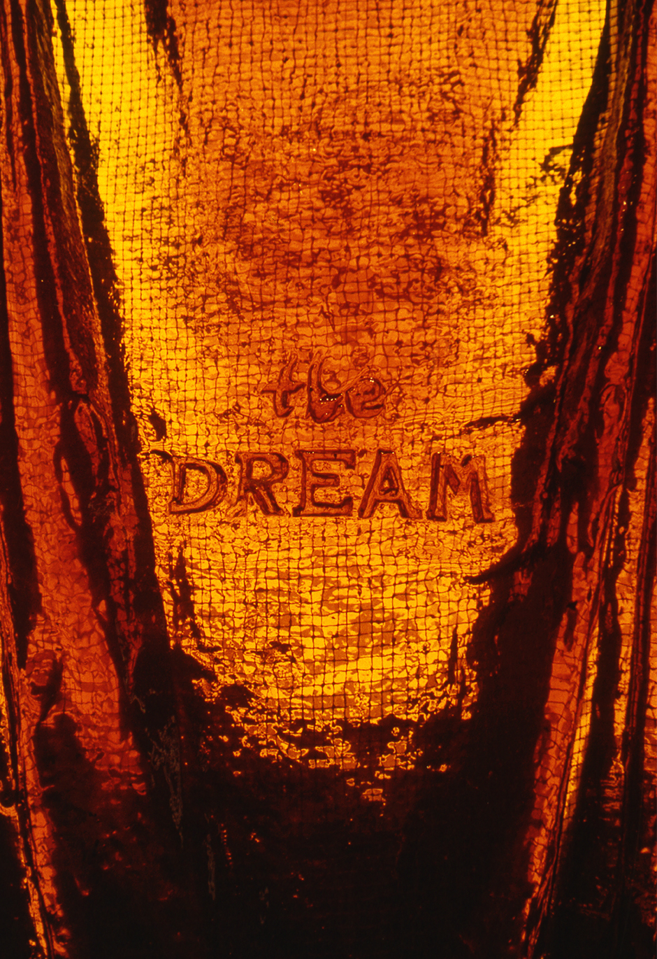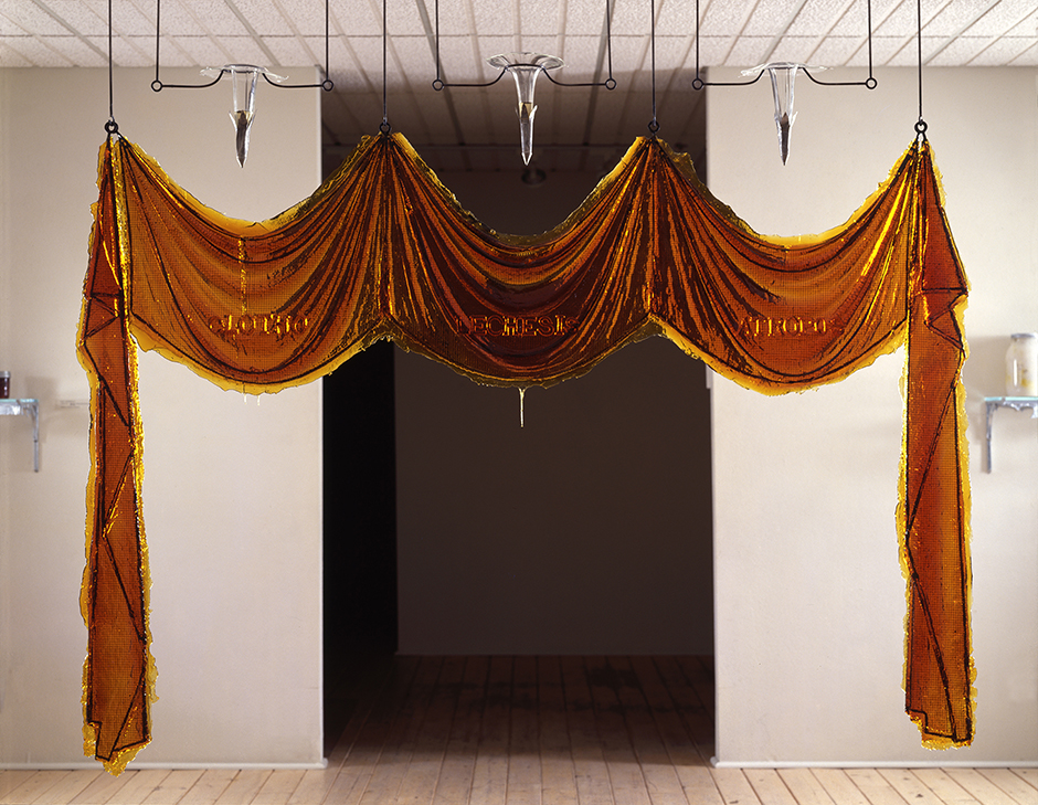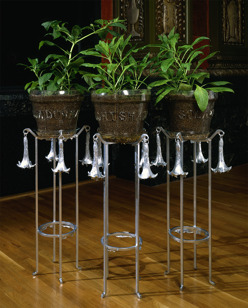The Linnaean name for belladonna (literally beautiful woman) is Atropa belladonna. In Greek mythology, Atropa is the last of the three Fates who are personified as women spinners of cloth. Clotho spins the thread of life, Lechesis measures is length and Atropa cuts the thread and determines death. This connection gave rise to the cloth imagery in the work, and interfaced with the plant laurel (sweet bay laurel or Laurus nobilis) as a symbol of fame, to produce the grouping Desire which includes the Laurel Mantle–a vanity area for the viewer. The glass perfume applicators are in the form of pistils and stamens (plant sex organs). The text on the pine rosin veil, the DREAM is undone, dissolved by oil of laurel, oil of desire. This might be the desire of a culture (utopianism, idealism), or a personal desire. This piece is ultimately about our complicity. It is the undoing of determinist notions in favor of acknowledgment of our willfulness. It is a vanitas.