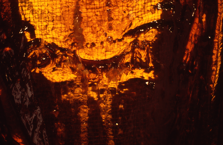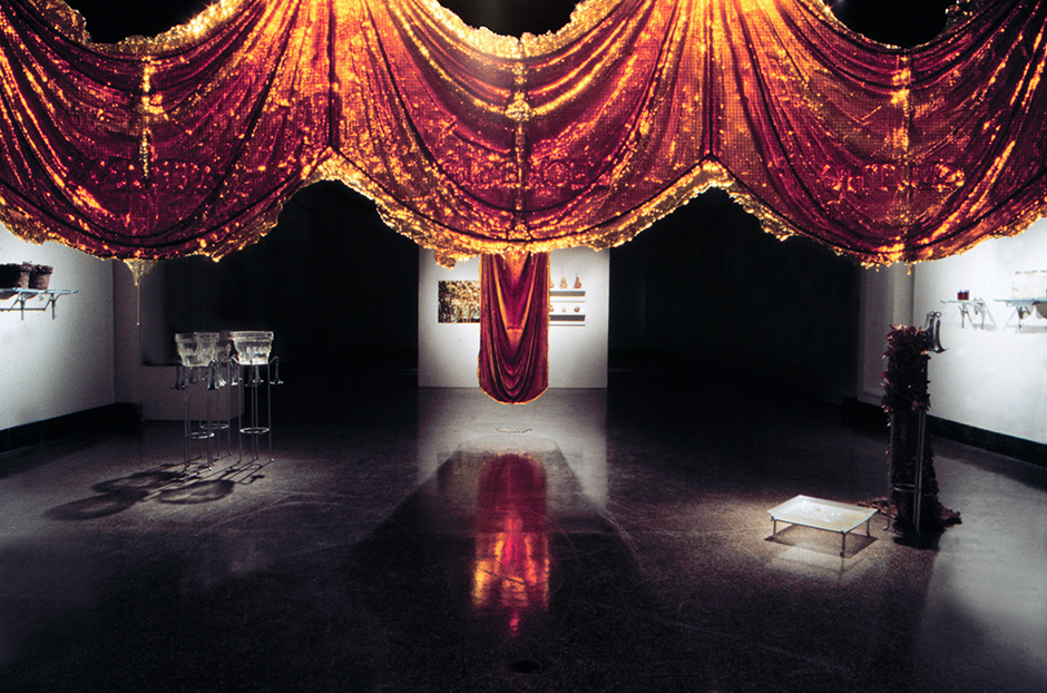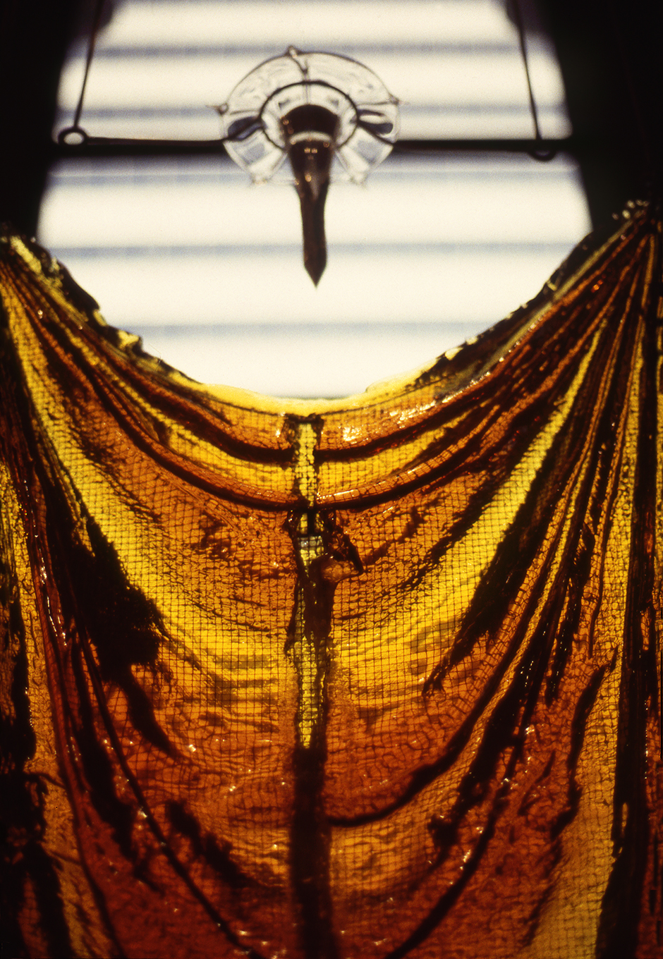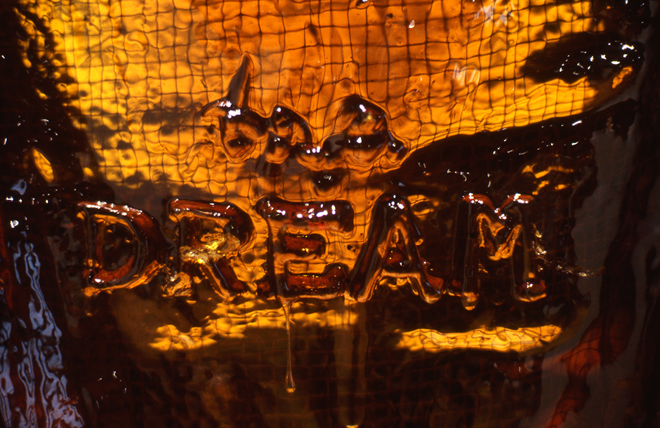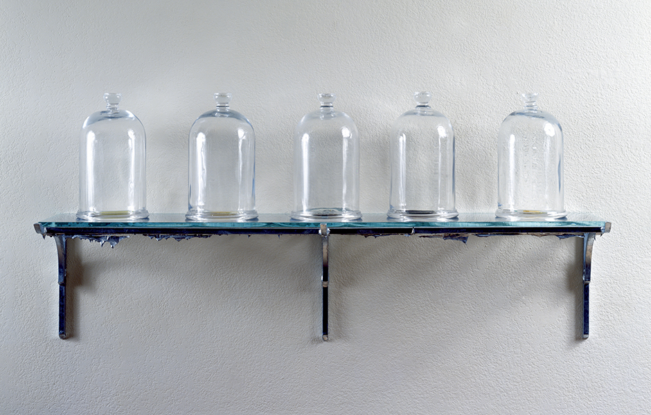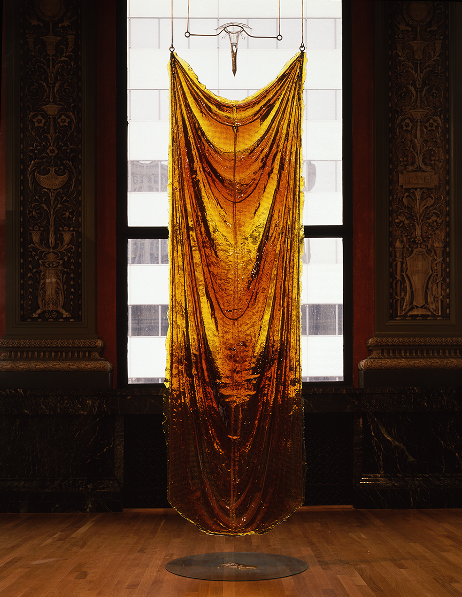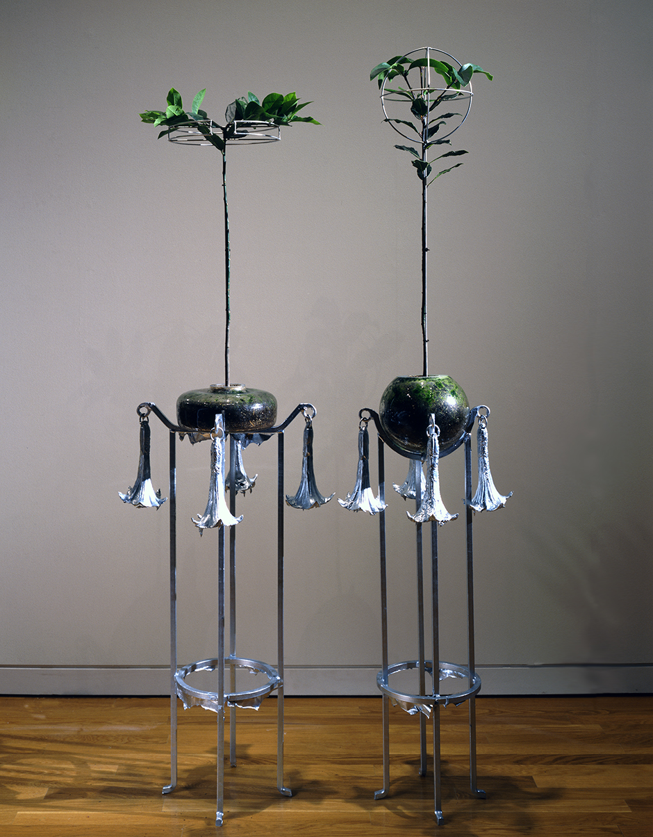 The Linnaean name for belladonna (literally beautiful woman) is Atropa belladonna. In Greek mythology, Atropa is the last of the three Fates who are personified as women spinners of cloth. Clotho spins the thread of life, Lechesis measures is length and Atropa cuts the thread and determines death. This connection gave rise to the cloth imagery in the work, and interfaced with the plant laurel (sweet bay laurel or Laurus nobilis) as a symbol of fame, to produce the grouping Desire which includes the Laurel Mantle–a vanity area for the viewer. The glass perfume applicators are in the form of pistils and stamens (plant sex organs). The text on the pine rosin veil, the DREAM is undone, dissolved by oil of laurel, oil of desire. This might be the desire of a culture (utopianism, idealism), or a personal desire. This piece is ultimately about our complicity. It is the undoing of determinist notions in favor of acknowledgment of our willfulness. It is a vanitas.