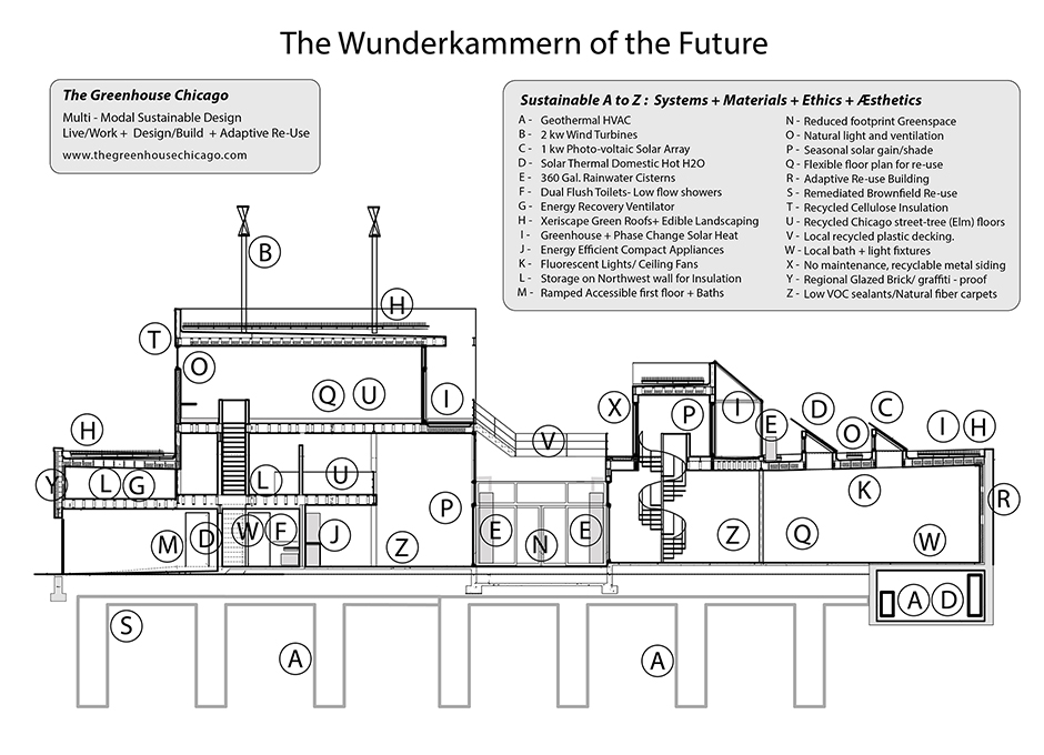 The project demonstrates Whitehead's concept of the Radically Multifunctional, pushing the limits of standard practice. Here the "complete set" of multi-generational and accessible design features, and available systems, amenities, and ethical design principles are integrated into the first multi-modal green residence in Chicago. Employing multiple artistic strategies including visual, conceptual and linguistic moves, even The Greenhouse Chicago's name, (a triple pun reflecting the color, ethos and conservatory on the roof) models this multi-valent approach.