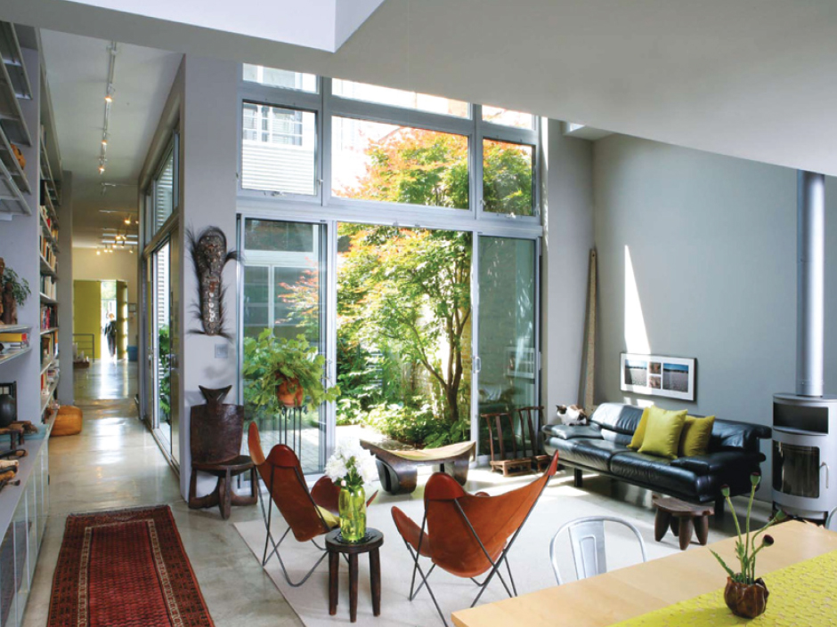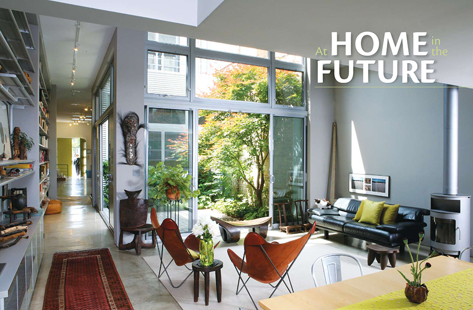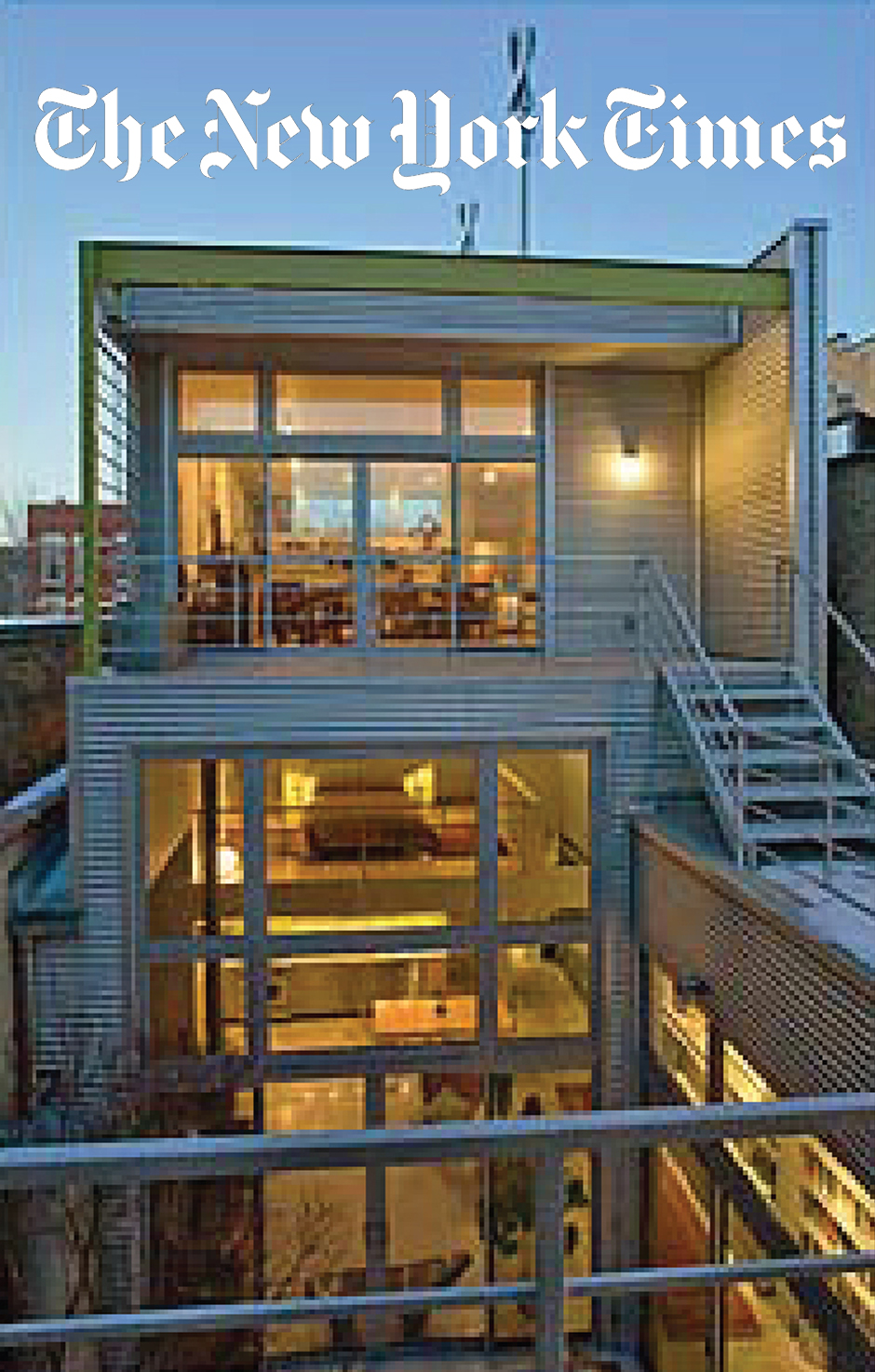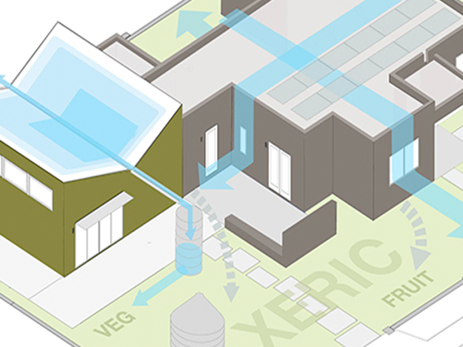 As architecture, the project integrates all available strategies and technologies including: geothermal heating/cooling, wind turbines, photo-voltaics and solar thermal panels in combination with other passive features to generate 50% of the household's energy needs. As a demonstration project, the building also includes other notable green design features, such as a greenroof, rainwater collection cisterns, interior courtyard and many local and recycled materials.